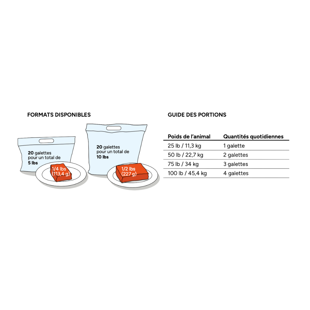 Exemple : un chien de 10 kg (22 lb) adulte consommera environ 200 à 300 g par jour.