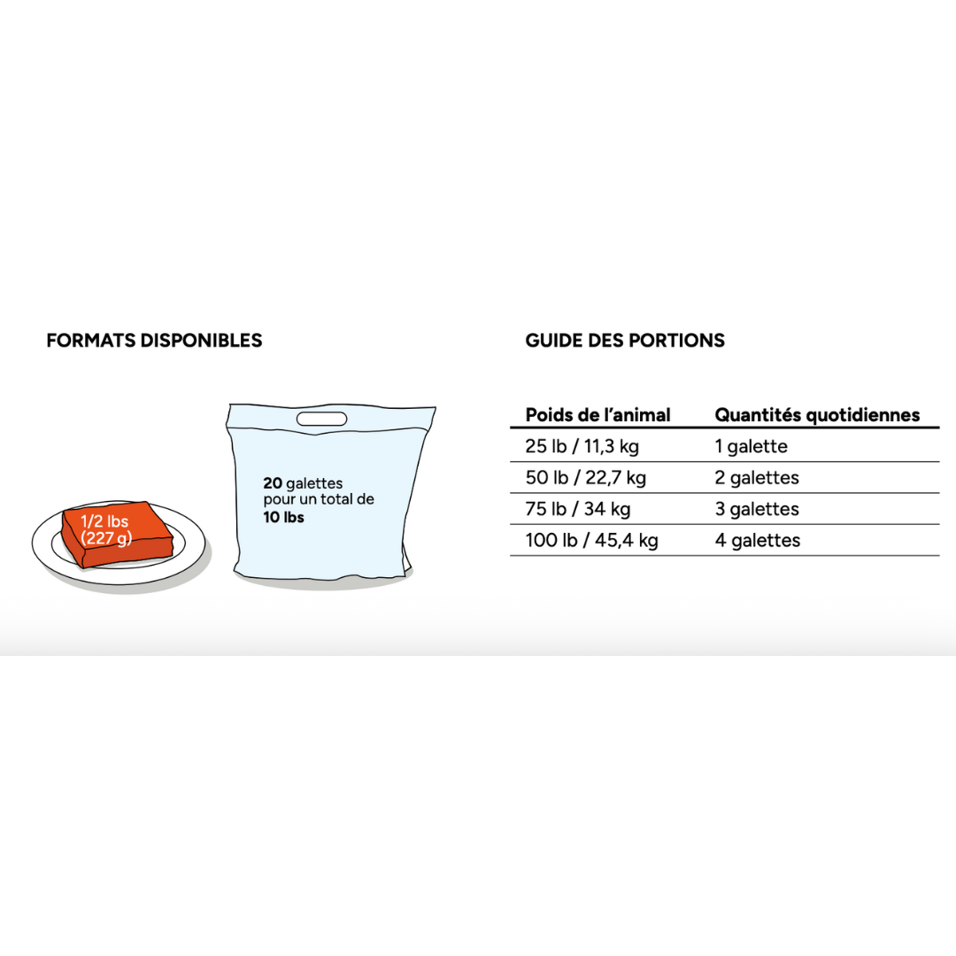 Exemple : un chien adulte de 20 kg (44 lb) consommera environ 400 à 600 g par jour.
