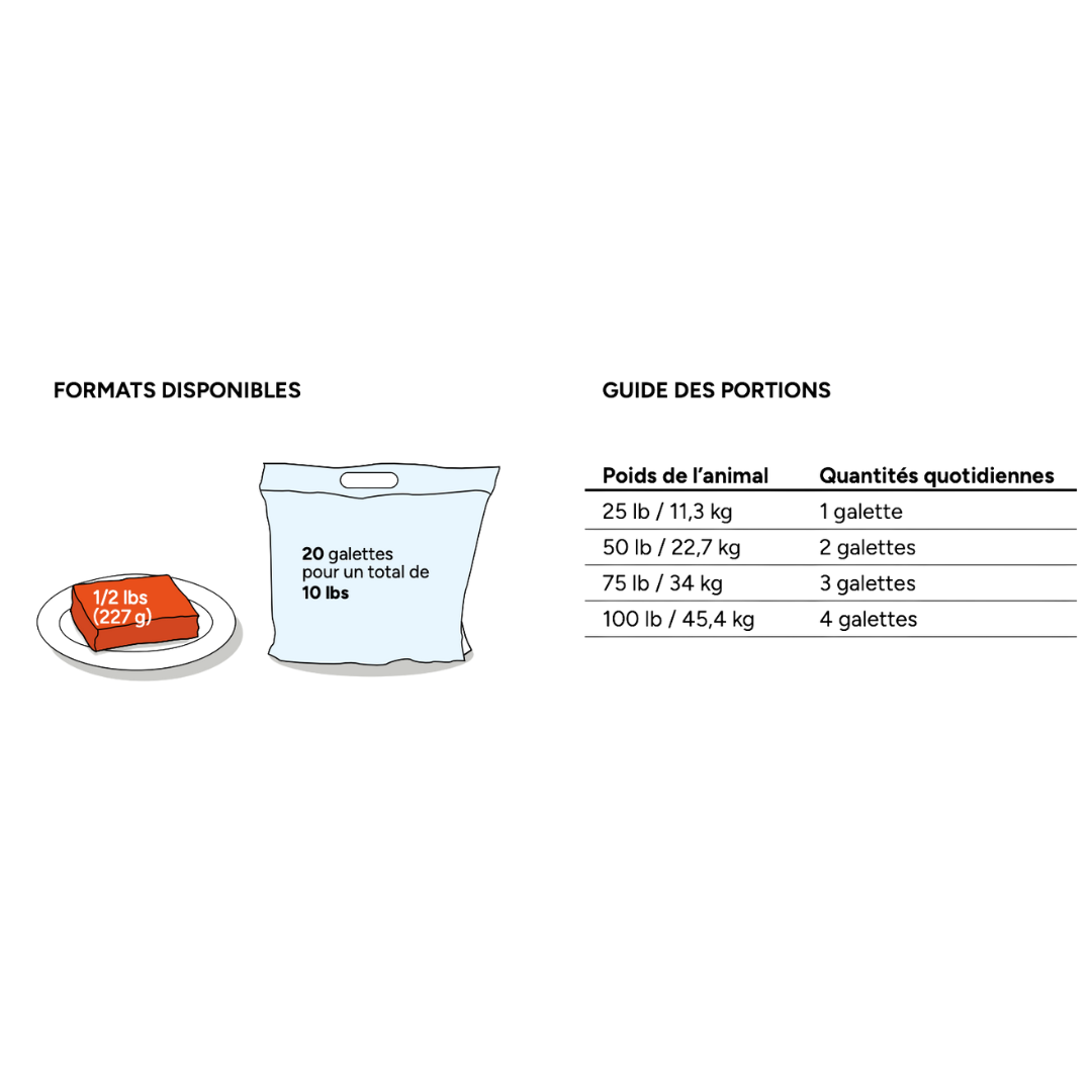 Exemple : un chien adulte de 15 kg (33 lb) consommera environ 300 à 450 g par jour.