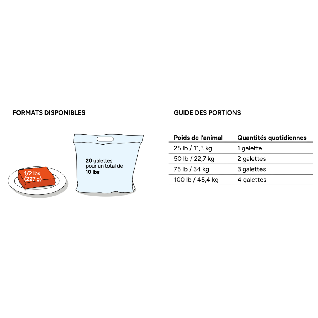Exemple : un chien adulte de 15 kg (33 lb) consommera environ 300 à 450 g par jour.