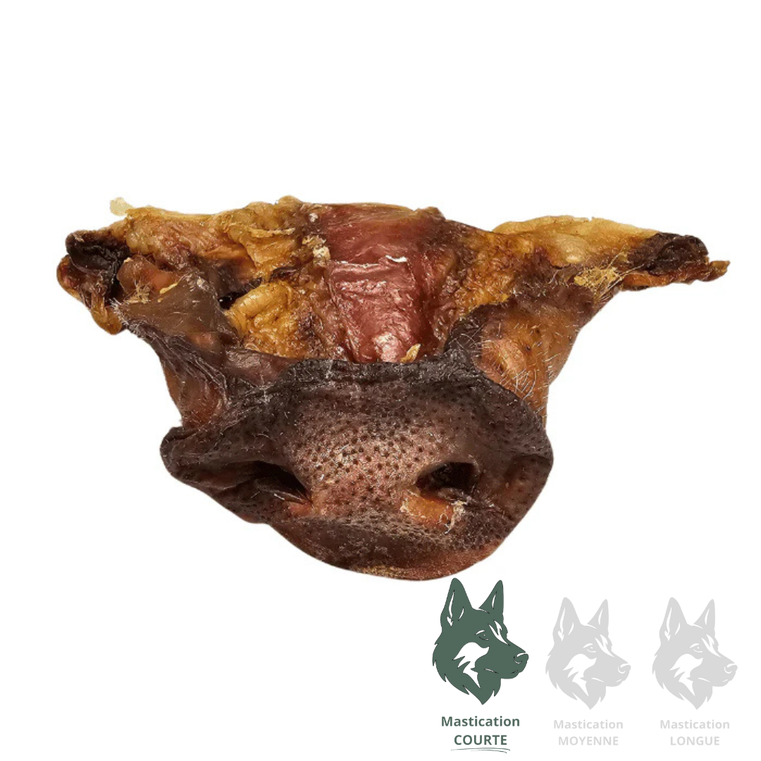 Le "Grand Valley Quail Museau de Porc" est un produit de friandise pour chien sous forme de museau de porc entier déshydraté, un produit du fabricant Grand Valley Quail. Le terme "museau" fait ici référence au nez du porc et est présenté comme une option de mastication naturelle pour les chiens.