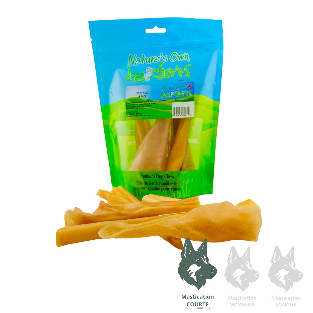 Les Rouleaux de Porc Nature’s Own sont une délicieuse option naturelle, riche en protéines et en matières grasses saines, parfaite pour les chiens qui aiment mâcher intensément.